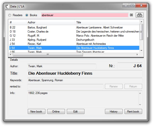 LiLA ist mehrsprachig, die Screenshots sind jedoch nur in englischer Sprache verfügbar. Sreenshots: Übersicht DatenhaltungSchüler 1 Schüler 2 Bücher 1 Bücher 2 Online-Daten